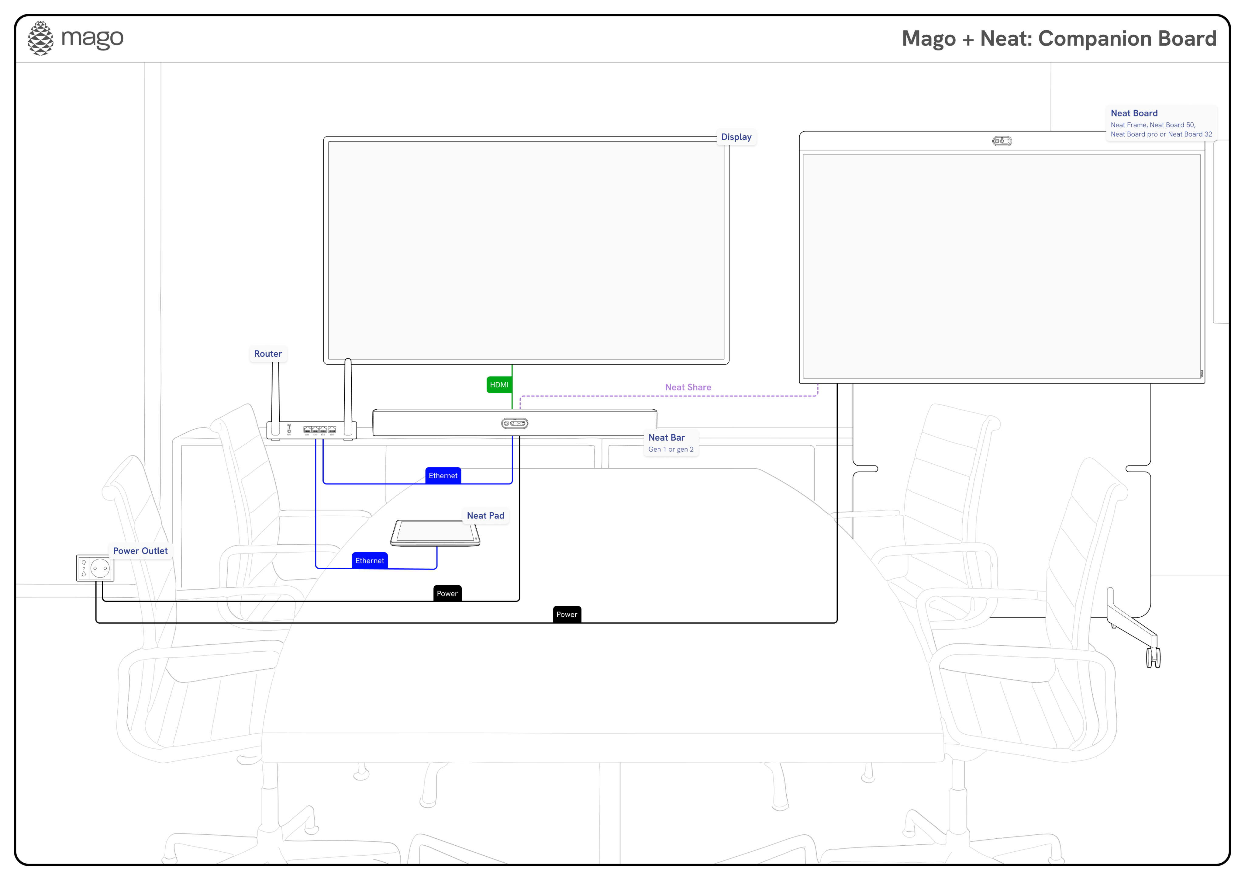 Use your Neat Board Pro, Neat Frame or Neat Board 50 as a Mago Companion Mode display to your existing Microsoft Teams Room or Zoom Room setup. With Neat Share, you can instantly ingest content or control the board directly from your Neat room, no extra cables, no complex pairing.