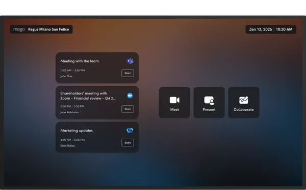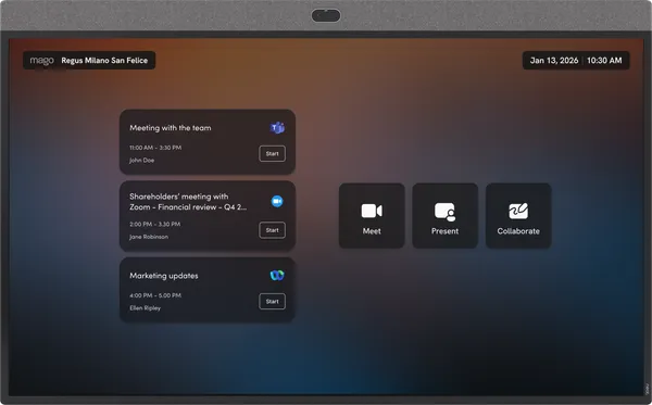 The Mago Admin Center gives you full remote control of your displays from a single, secure cloud panel. Apply over-the-air updates, configure policies, and monitor usage in real time. Access detailed analytics to track performance and optimize your meeting spaces, all without leaving your desk. Also available on-prem.